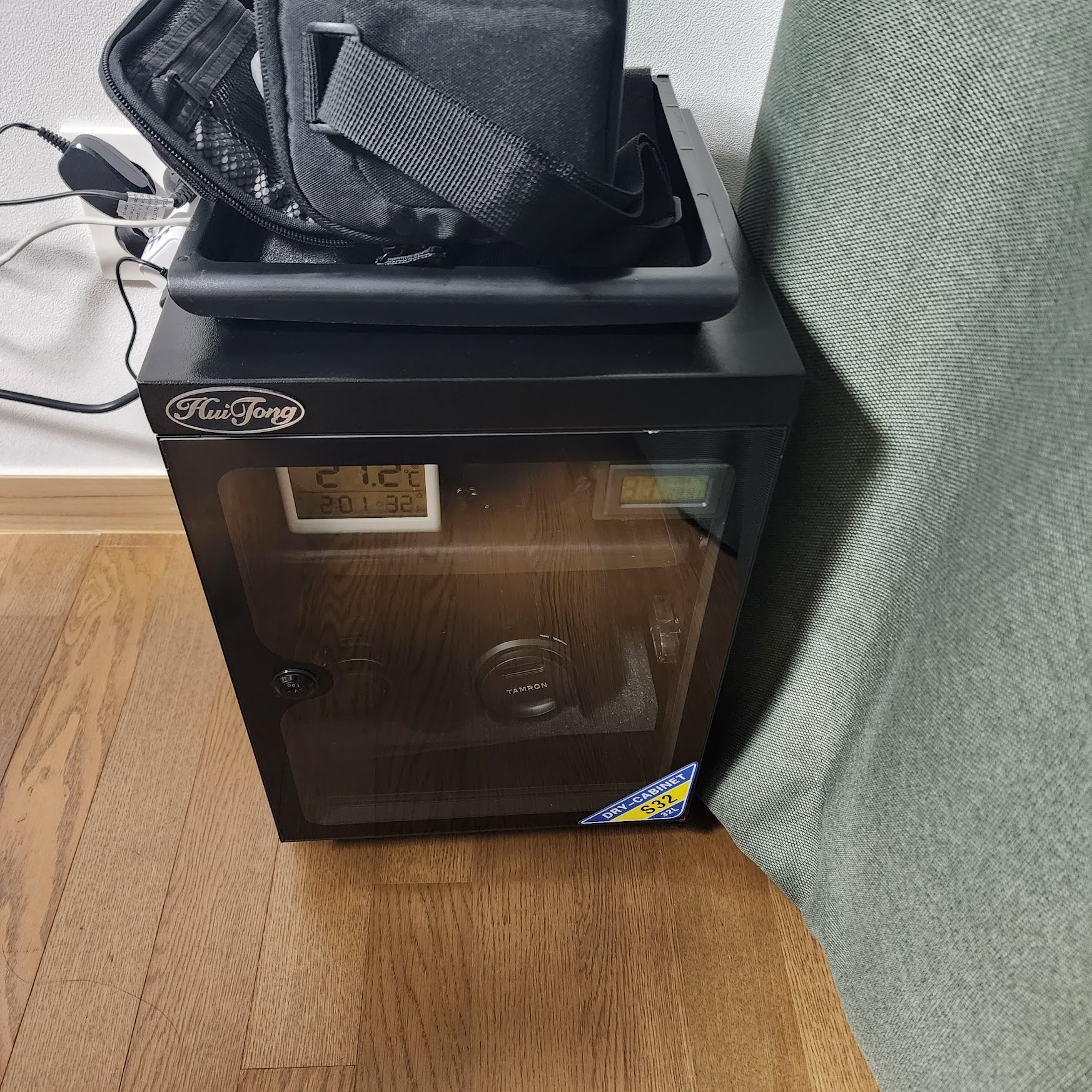 설치하고 렌즈와 바디를 넣어두었다. 2층은 1층의 공간만 좁게 만드는 듯 하여 서랍을 뽑아 기계 위에 올려두었다. 위에는 바디, 아래에는 렌즈를 나열해두고 쓰고 있다. 설치한지 3일이 지난 오늘 확인해보니 습도는 30%정도로 유지되고 있다.